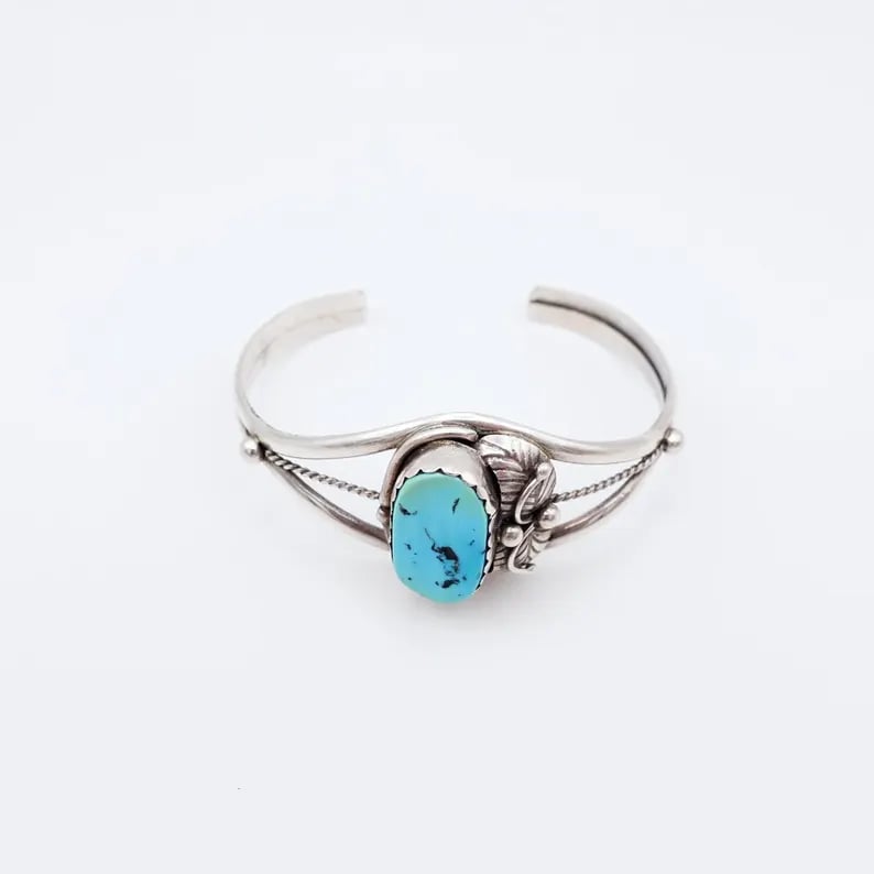 This is a wonderful Native American sterling silver cuff bracelet in a wire work design, with two bands holding the central piece and a rope or barley twist silver bar along the centre. The stone is unusual, unlike many pieces with turquoise cabochons, the stone has an smooth but uneven surface, where the chisel marks add to its design.